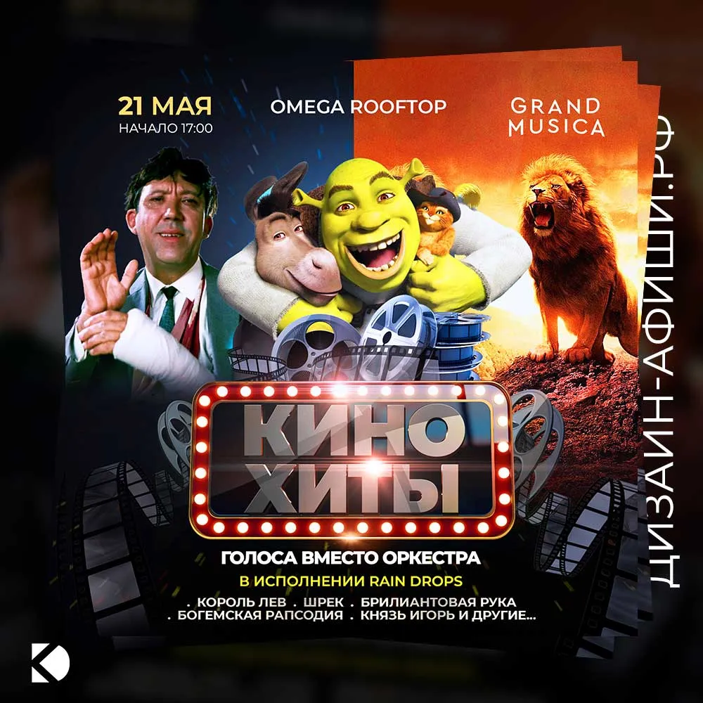 Разработать афишу для акапелла-шоу с программой кинохитов.