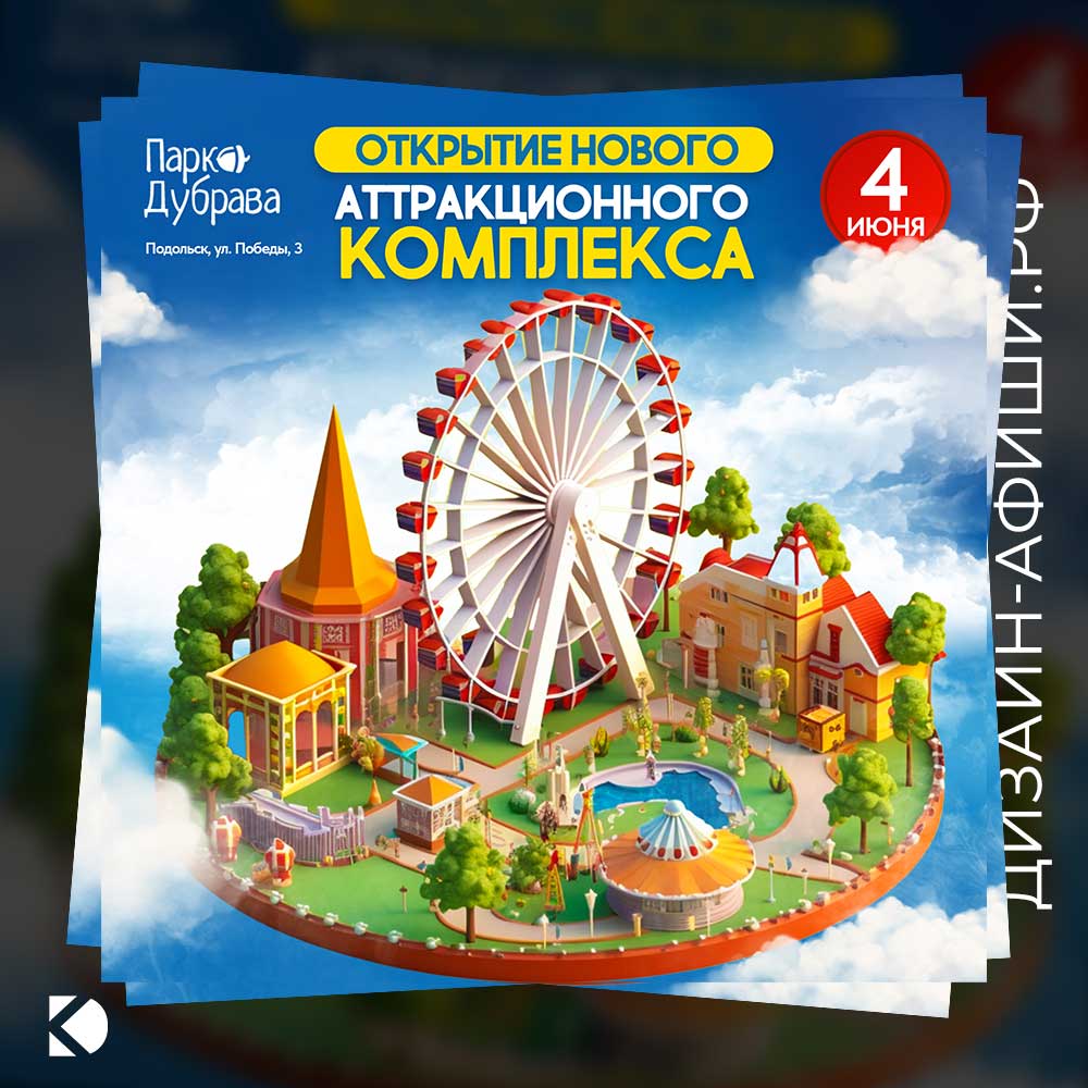 Разработать афишу для открытия нового аттракционного комплекса в парке «Дубрава» (Подольск).