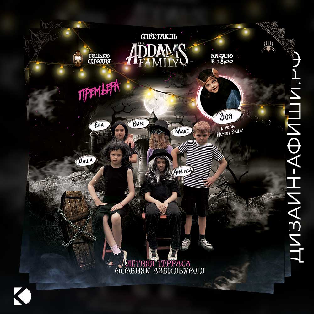 Создана оригинальная афиша в стилистике мюзикла, которая использовалась как приглашение на день рождения. Дизайн включает персонажей и атмосферу семейки Аддамс, адаптирован для печати и для публикации в соцсетях. Гости отметили необычный стиль и тематическое оформление праздника.