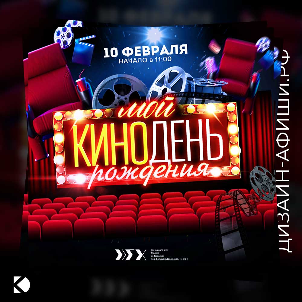 Разработать афишу для мероприятия «Кинодень» в киношколе «ЦЕХ»