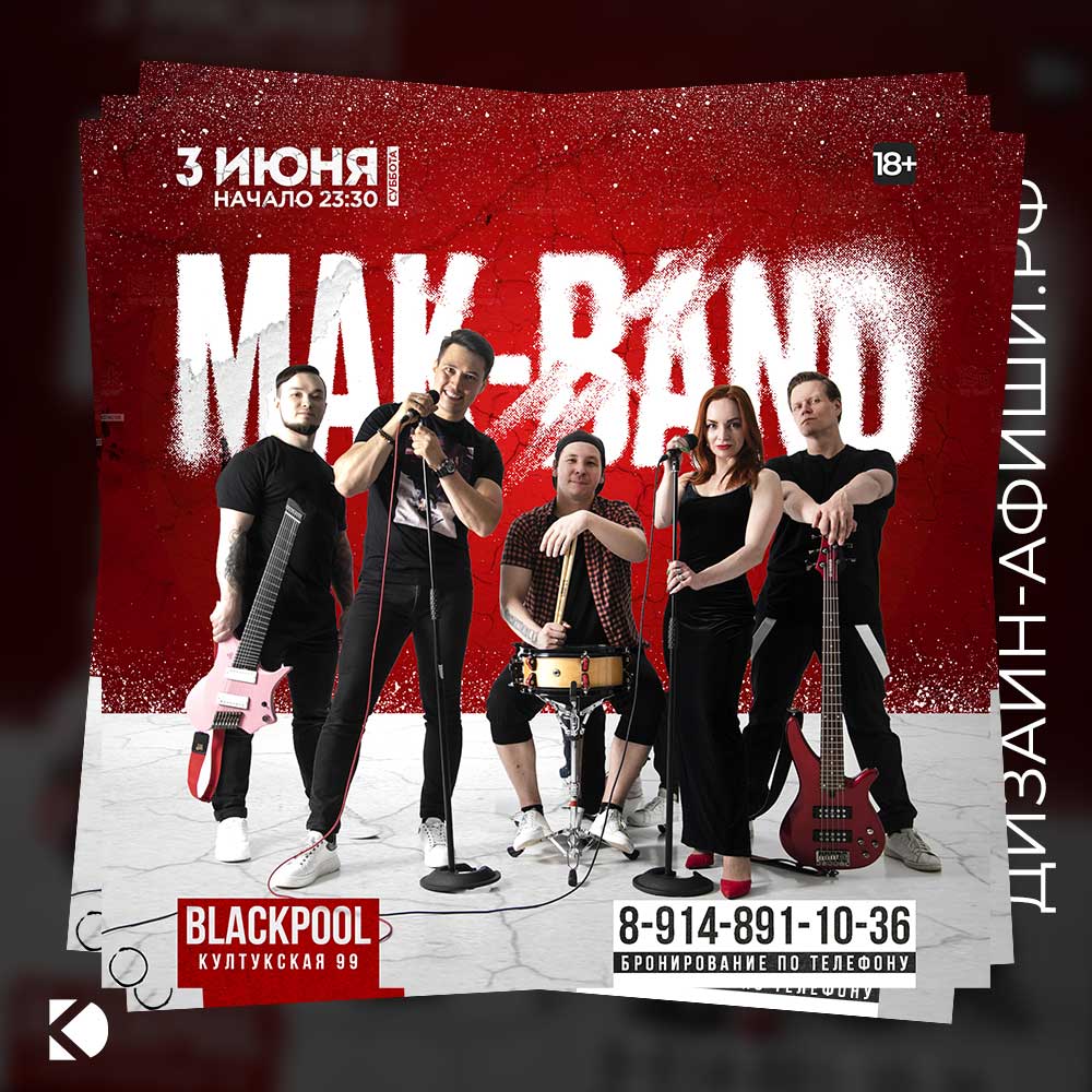 Разработать афишу для концерта группы «Makband» в ночном клубе Blackpool (Иркутск) 3 июня.