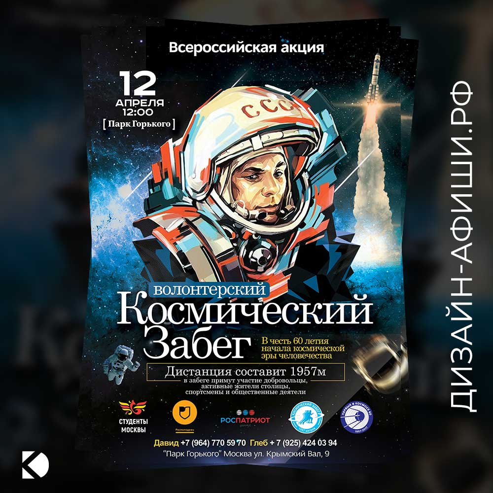 Разработать афишу для всероссийской акции «Волонтерский космический забег» в парке Горького, посвященной Дню космонавтики.