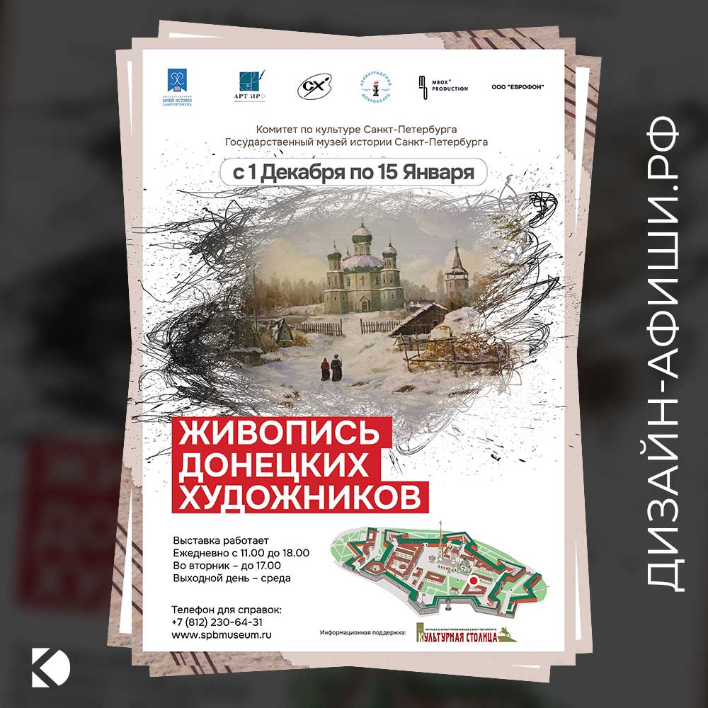 Разработать афишу для выставки живописи донецких художников, проходящей в Государственном музее истории Санкт-Петербурга с 1 декабря по 15 января.